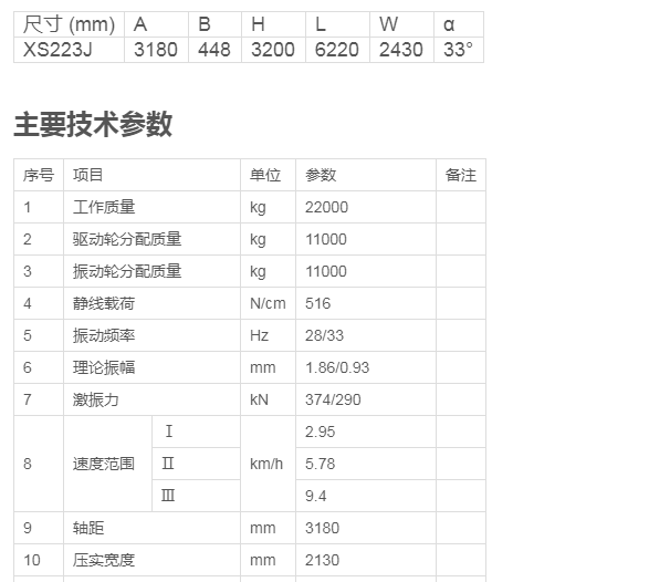 XS223J振動(dòng)壓路機(jī)是一款高效節(jié)能超重型機(jī)械驅(qū)動(dòng)單鋼輪振動(dòng)壓路機(jī)。適宜于卵石、砂性土壤、冰磧土、爆破巖石和粘性土壤的壓實(shí)作業(yè),也適宜于各種大型工程中對(duì)混凝土、穩(wěn)定土的基礎(chǔ)材料的壓實(shí)。