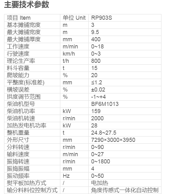 RP903S型瀝青混凝土攤鋪機(jī)是根據(jù)產(chǎn)品市場需求,以及我公司的攤鋪機(jī)現(xiàn)狀開發(fā)的一款9米高端大型攤鋪機(jī),是與德國VOGELE S2100-3、S1880-3為同一技術(shù)檔次產(chǎn)品,在部分技術(shù)上還處于領(lǐng)先的地位,主要適用于攤鋪瀝青混泥土面層施工,其****攤鋪寬度可達(dá)9.5米,是高等級公路建設(shè)中重要的施工設(shè)備。